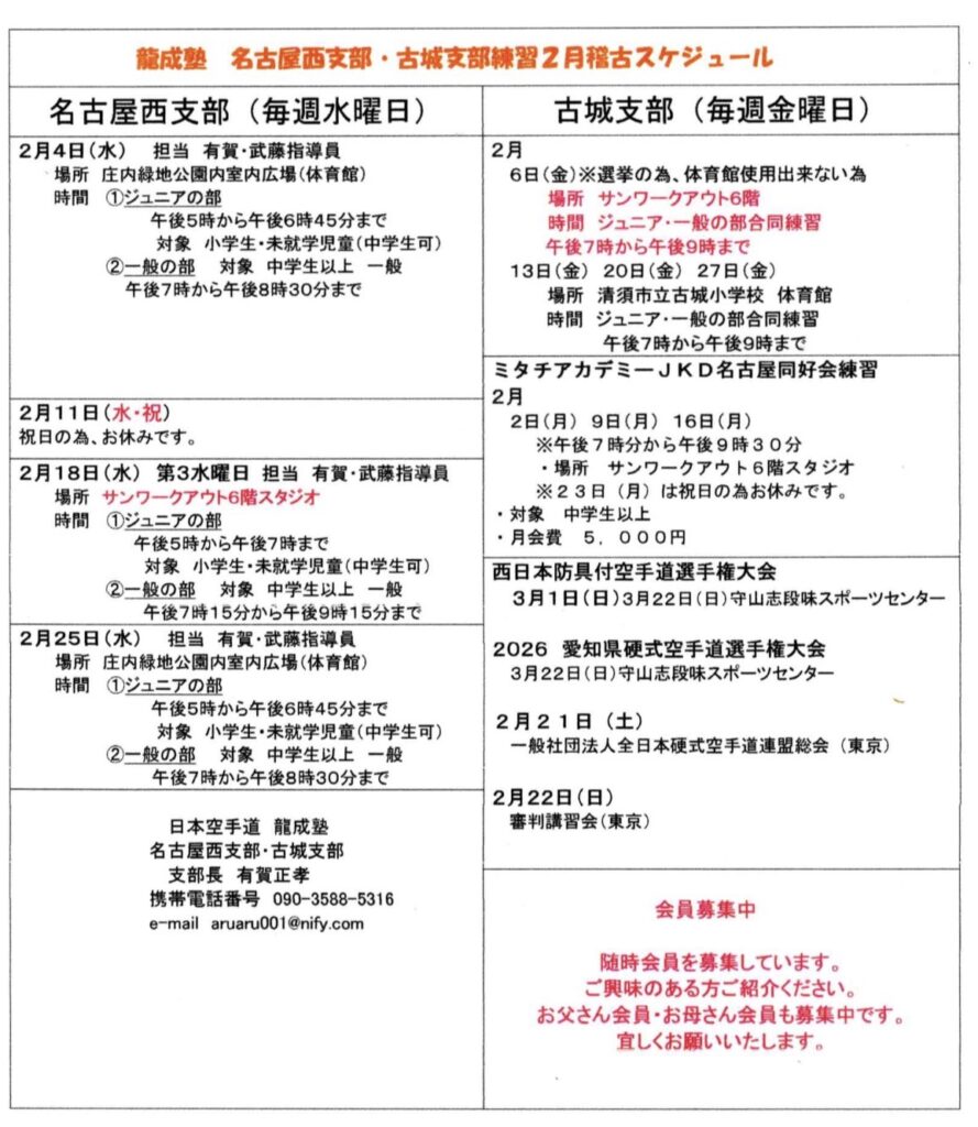 2026 名古屋西支部・古城支部2月予定表