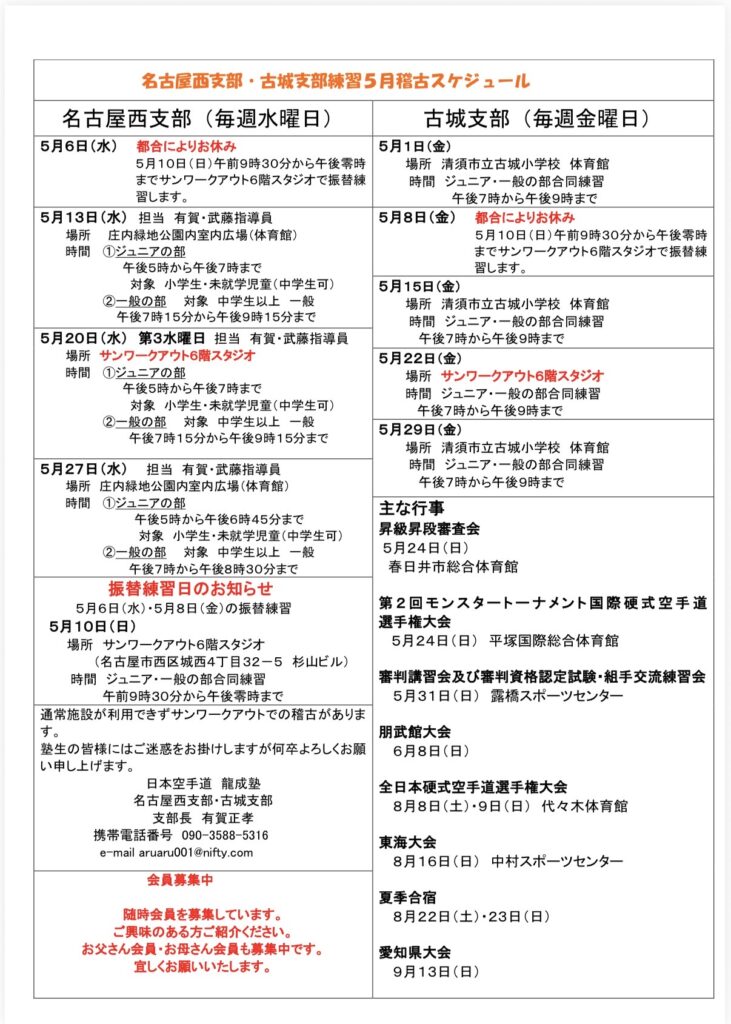 名古屋西支部・古城支部5月稽古予定表